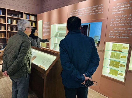 陈睦详细了解潘序伦校长开创“三位一体”事业的历程,为中国会计教育事业做出的杰出贡献,以及我校传承潘序伦教育思想、培养高素质应用型财经人才的办学成果,参观嘉宾不时拍摄展陈内容。文博中心副主任郎莹君接待讲解。