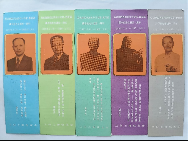 三月中旬,文博中心档案馆收到立信会计专科学校1984届校友郭有伟捐赠给学校档案馆永久留存的一套书签。书签一套五张,分别印有不同年代潘序伦老校长的照片和名言,书签背面印有1987年全年月历。这是1986年为纪念潘老去世一周年特制的纪念品,由立信会计图书用品社(现立信会计出版社)发行。