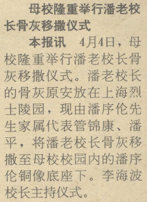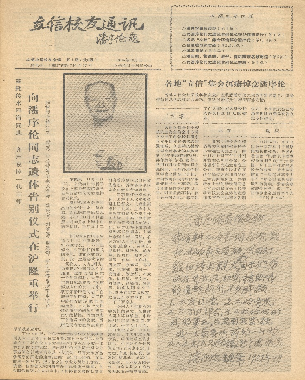 历史的指针回拨到1985年11月8日,潘序伦老校长因病谢世。虽然潘老留下了身后一切从简的遗嘱,但悲痛中的社会各界和立信师生不忍德高望重的会计泰斗悄然无声地离去,于11月20日在龙华殡仪馆举行了潘序伦遗体告别仪式。上海市有关领导、中外友宾、立信校友及立信学生1200余人前往送别。全国人大常委会副委员长胡厥文、全国政协副主席刘靖基,财政部、审计署、中国会计学会、中国审计学会等单位,上海市领导张承宗、潘老挚友李文杰等个人及外国友人发来唁电唁函,字里行间表达出对潘老辞世的不胜悲痛和对会计界巨星殒没的遗憾惋惜。此外天津、北京、重庆、宜兴、杭州、贵阳等各地立信会计学校纷纷集会,在各种形式的悼念活动中追忆潘老校长开拓和发展立信会计事业的卓著功勋。