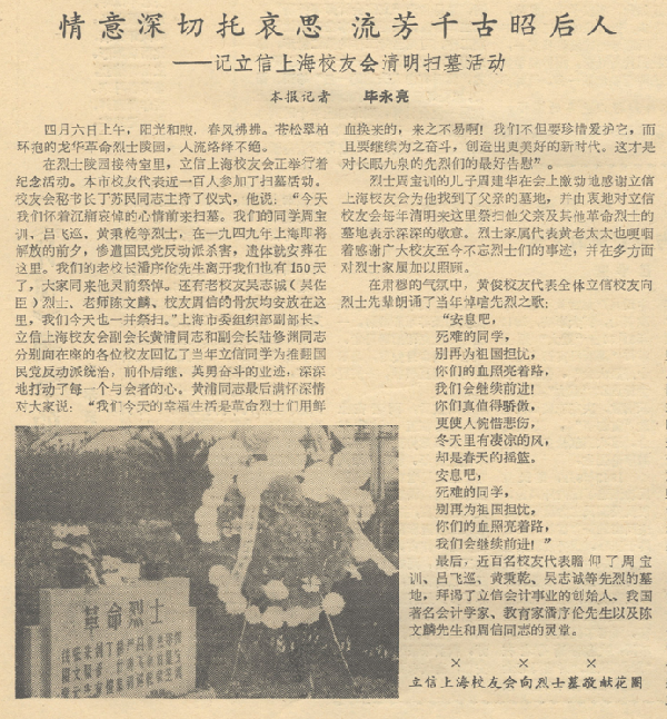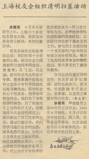 从那以后的每个清明节,学校都会开展“托哀思昭后人”的祭扫活动。每一次祭扫就是一次深切怀念,怀念为国捐躯的革命烈士,怀念誉满天下的会计大师,怀念鞠躬尽瘁的老师同学,通过扫墓活动学习立信先贤的高贵品质,继承先烈遗志,为振兴立信事业而努力奋斗。