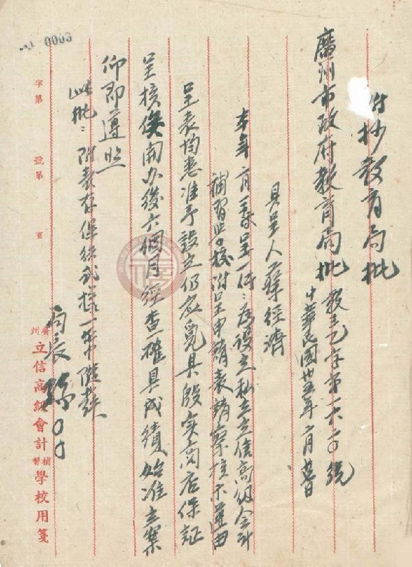 1946年2月,广州市教育局批准设立广州市立信高级会计职业学校。学校首期招生录取1个高级班、2个初级班。