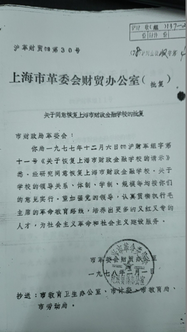 1978年2月1日,经上海市财贸办公室同意恢复“上海市财政金融学校”,并于同年9月复校招生,校址暂定昆山路146号。