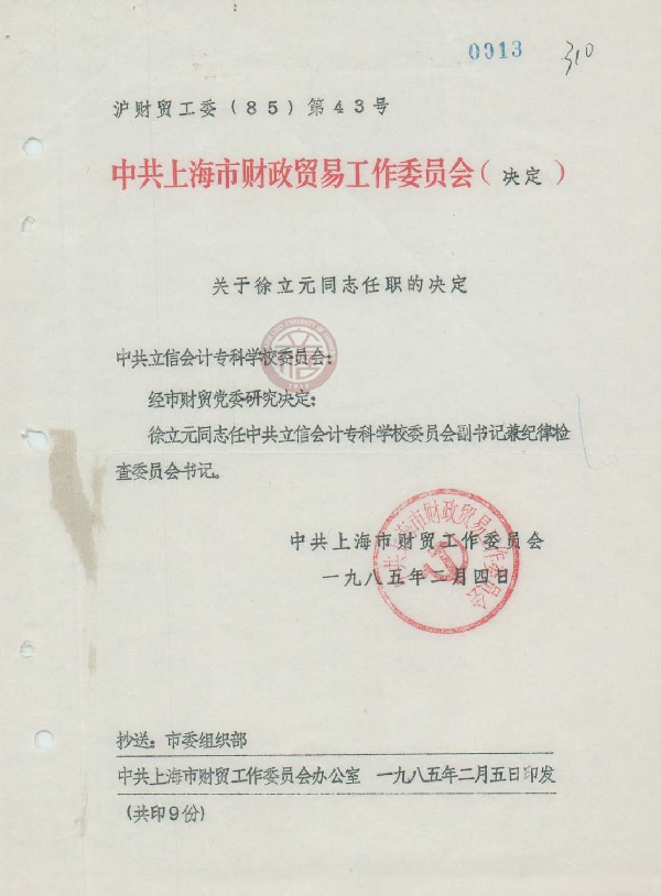 1985年2月,中共上海市财贸党委决定,徐立元任立信会计专科学校党委副书记兼纪委书记。