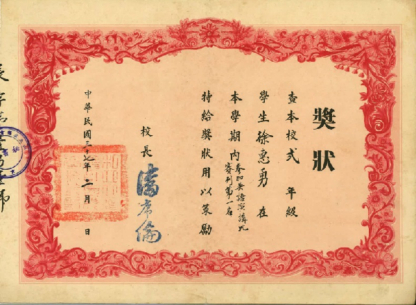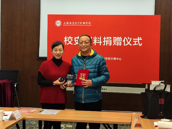 为支持学校校史文化建设工作,徐瑞荣先生向学校无偿捐赠其父亲徐惠勇(1948届)校友收藏的37件校史资料,赵心耘先生向学校无偿捐赠其母亲缪競慧(1948届)校友的毕业证和入职公派函。文博中心主任崔亦田、中国会计博物馆原馆长宋小明接受捐赠并为徐瑞荣先生、赵心耘先生颁发捐赠证书。本次捐赠的校史资料中包括民国时期的奖状、毕业证、成绩单等实物及照片,虽历经七十余年时光仍保存完好十分珍贵。